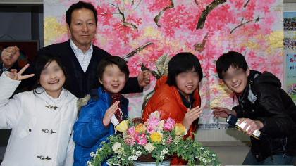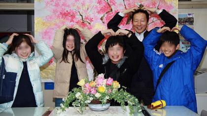 校内探検の最初は校長室で記念撮影です。バックの絵は、先日の「ありがとうの会」の装飾のために6年生の保護者の方が描いてくださった桜の絵です。華やかでしょう! 思い思いのポーズで写真に納まりました。この写真はこの日の帰りまでにプリントアウトされて配られました。 〜つづく