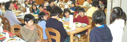 9日、1年生が「ありがとう給食」の会を行いました。これは4月に給食が始まった頃、地域の皆さんに「教育支援活動」の一環として、給食準備や片づけを手伝っていただいたことに対するお礼の会です。今日は全部で9名の方にお出でいただき、子どもたちと一緒にランチルームで給食を食べてもらいました。