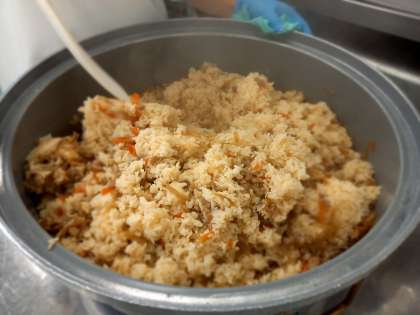 ※写真3枚目は、豚肉とごぼうのごはんが炊きあがったところです。具とごはんが均等になるように、丁寧にまぜてくれています。