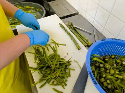 アスパラガスは4月〜6月が旬の食材です。新鮮でしっかりしたアスパラガスが納品されました。今日はサラダに使用しています。