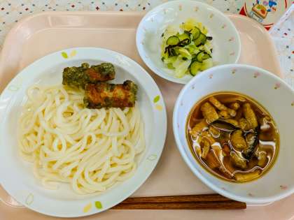 今日は子どもたちに人気のうどんです。昆布、かつお節、さば節でとっただしはうま味がしっかりしただしがとれました!