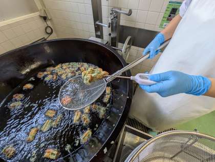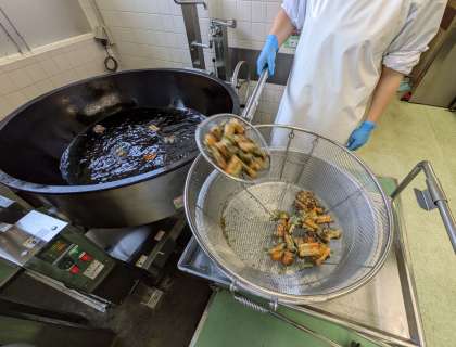 ※写真2枚目は、揚げたちくわの温度確認をしているところです。
