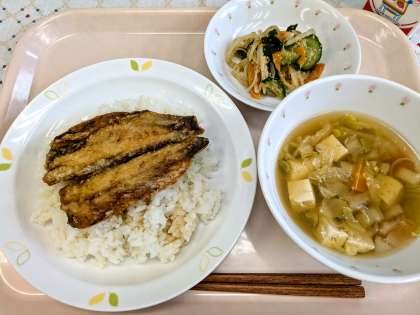 今日は入梅献立です。入梅とは、暦の上での梅雨の始まりです。この時期の代表的な魚は「いわし」で、入梅の時期にとれるいわしのことを入梅いわしともいうそうです。この時期のいわしは脂がのって美味しいといわれています。今日は「いわしの蒲焼き」にしました。