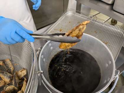 ※写真2枚目は、揚げたてのいわしをたれにさっとくぐらせているところです。