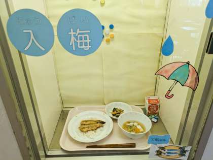 ※写真3枚目は、入梅献立にちなんで飾り付けをしてみました。事務職員さんの手作りの傘がとっていも素敵です。