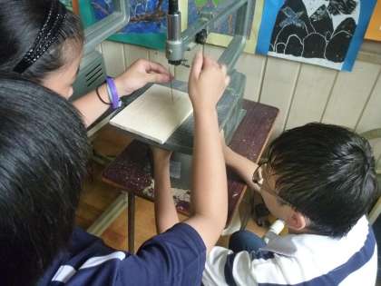 電動糸鋸もその一つ。好きな形に切り抜くためにはこれを使いこなさなくてはなりません。取り付けから苦労しますが、友だちと協力して教えあいながら困難を切り抜けます。