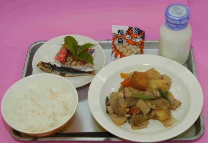 今日の献立は「牛乳 ごはん イワシの丸干し 筑前煮 福豆」です。