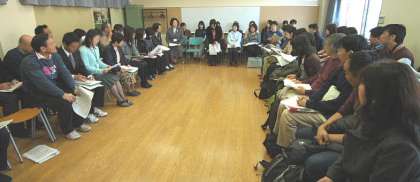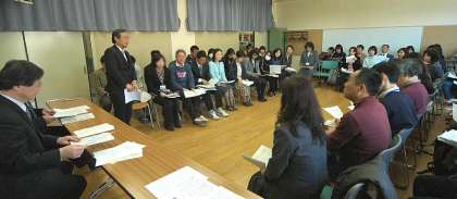 4月3日、昼前に、九品仏小学校、八幡中学校、本校の職員が八幡中学校に集まり、今年度始めての教職員顔合わせ会を行いました。三校は「世田谷9年教育パイロット校」のグループ校に指定されており、小中連携教育を進めています。その関係から異動もあった職員が互いに名前と顔を知り合うことから始めようということで、新年度早々でまだ各校とも始業式前のこの時期ではありますが行いました。これから何かと連絡をとりあうこともあると思いますので、この機会に顔見知りになったことは、今後に生かしていけそうです。