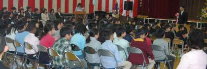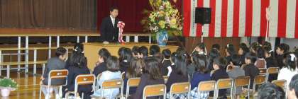 入学式の様子です。入場も行儀良く、校長、来賓の話も落ち着いて聞くことができました。お忙しいところかけつけてくださったたくさんのご来賓の皆さんも、感心していました。式終了後、2年生が歓迎の出し物を披露。新入生はもちろん、ご家族からも大きな拍手をもらい、これからの学校生活のやる気が何倍にもなったようです。おかげさまで、すてきな入学式になりました。