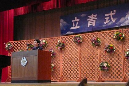 八幡中学校の「立青式」とは、14歳(数え年で15歳、昔の元服)をむかえる2年生に、その前途を祝う会として青少年九品仏地区委員会との共催で行われている行事です。昭和44年に始まり、他校にはない行事です。今年で第40回となり、式典だけではなく、生徒の将来への希望を述べる、意見発表を行っています。