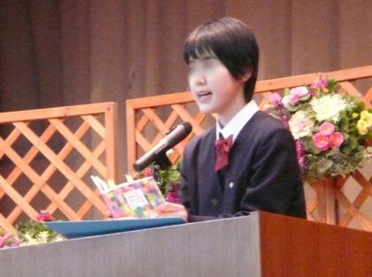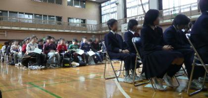 その場に、今年から九品仏小学校と本校の児童も参加して前途を祝うとともに、自分たちの中学校へ向けての心構えをもたせるという目的もあります。2年生8名の意見発表に、真剣に聞き入っていました。