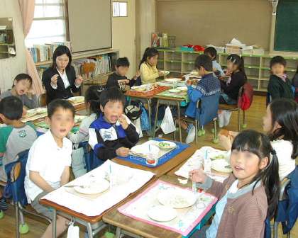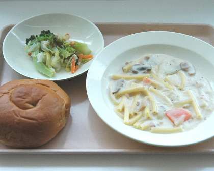 4月7日、今年度最初の給食です。メニューは黒糖パン、マカロニのクリーム煮、ブロッコリーサラダ、ここには写っていませんがパックのりんごジュースがつきました。子どもたちにとっては久しぶりの給食なので、みんな大喜びでした。写真は2年生のようすです。