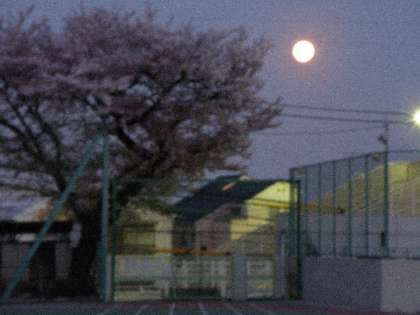 9日、今夜は満月です。写真は、職員室側から東門方面を撮影したものです。満開の桜に満月。春爛漫ですね。