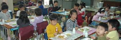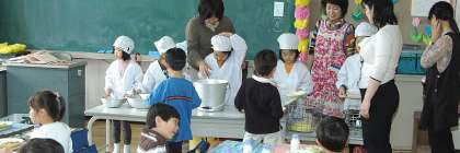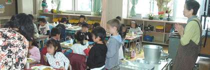 14日火曜日から、1年生の給食が始まりました。メニューはカレーライスとサラダ、牛乳です。終了時刻を考えて、他の学年より少し早く給食準備を始めました。この日から地域の方による1年生給食支援も始まり、さっそくクラス1名ずつお手伝いについてくださいました。また、専科の教員もお手伝いにつきました。そのおかげもあって、1年生は当番や配膳など、1日目からしっかりできていました。