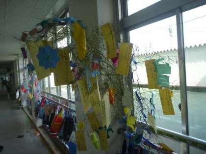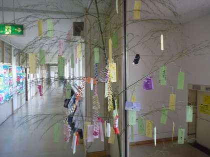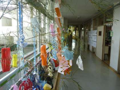 本校では、毎年、図工室の裏の竹を切って七夕飾りを作っています。みんなの願いを書いて、折り紙などで、綺麗に飾ります。