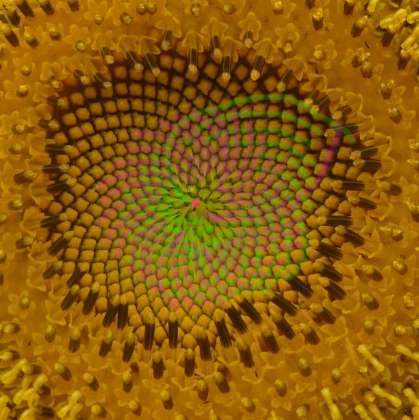 種の部分に左回りと右回りに色を変えて線を引きました。右回りの緑の線が22本、左回りのピンクの線が34本です。どうですか。ほぼ、フィボナッチ関数の数字になっていますね。