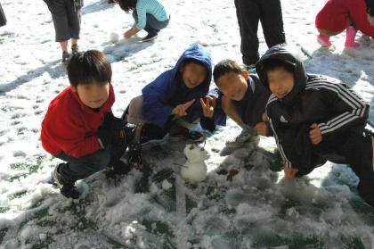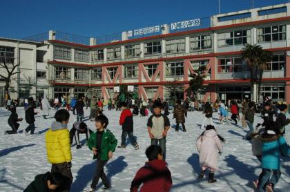 昨日降った雪が校庭に積もり、体育館で行った朝会の後に全校で雪遊びをしました。青空のもと、担任の先生も混じって元気に雪遊びに興じる子どもたち。大喜びでした。
