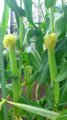 八幡のトウモロコシ、実がなってきました。トウモロコシは自家受粉はしません。必ず違う個体から花粉をもらわなければ、実がなりません。そこで、トウモロコシは密集して植えることになります。