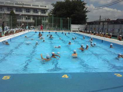 低学年の水泳検定です。準備運動や水遊びをしてから検定しました。水の中は気持ちよさそうです。合格した子どもたちは進級テープを受け取り、嬉しそうに帰って行きました。