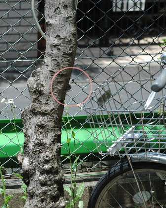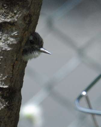 学校の北側駐輪スペースの枯れ木に巣穴を彫って住みついている?コゲラ(キツツキの仲間)です。この写真を見ると、本当にどうしてこんなところに?と思いませんか。巣があることに気づいていない方が、自転車をすぐそばに置いていますが、それでもコゲラは巣穴にはいってチョコンと顔を出しています。観察していたところ上空をカラスの影が横切った時にはビクッとしたように首を縮めていました。この後、無事にこの場所で卵を産んで子育てができるのでしょうか?