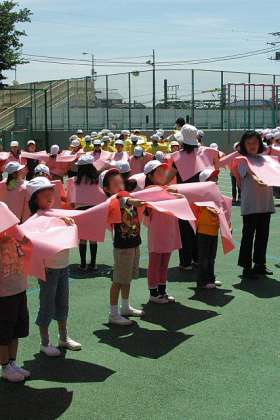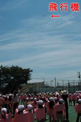 つづき〜 並び終わって準備終了。やがて飛行機が上空に。子どもたちはエプロンを前に広げいよいよ撮影です。4,5回上空を旋回して撮影後、みんなの見守る中、翼をふって飛びさりました。 〜つづく