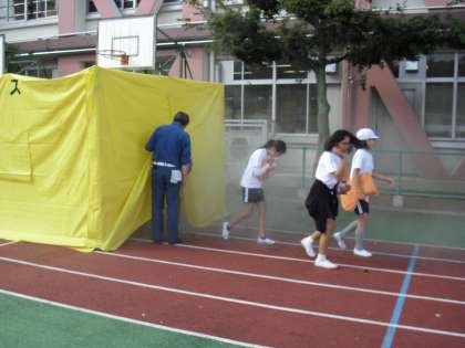 その後、3、6年が煙体験をしました。まったく前が見えない中で、どのように避難したらいいか、消防署の署員のみなさんから説明を受け、テントに充満させた煙の中を出口まで進む訓練をしました。