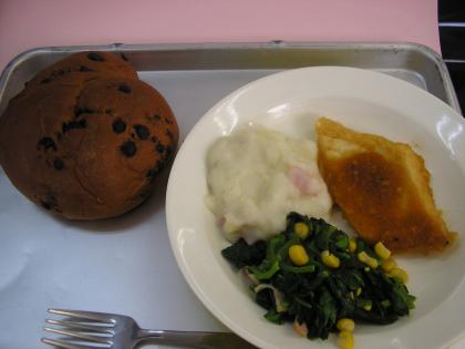 今日の給食は、チョコチップパン、ほうれん草のソテー、