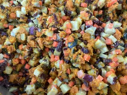 パンプキンサラダはかぼちゃ、さつまいも、にんじん、レーズンを使ったちょっと甘みのあるサラダです。
