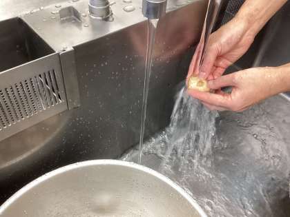 ※写真2枚目は、戻した干ししいたけのひだの中までていねいに洗っているところです。