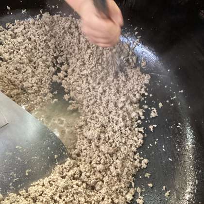 ※写真3枚目は、ひき肉がダマにならないようによく混ぜているところです。