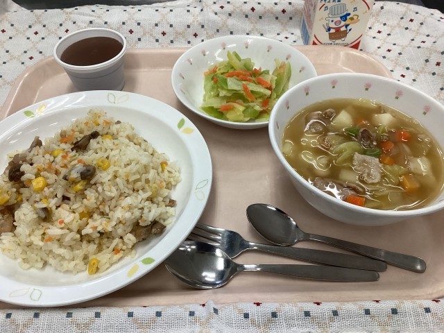 今日のスープは「からだの調子を調える」緑のなかまのやさい、「血や肉になる赤いなかま」の豚肉・ベーコン・白いんげん豆、「熱や力の元になる黄色いなかま」のじゃがいもが入っています。