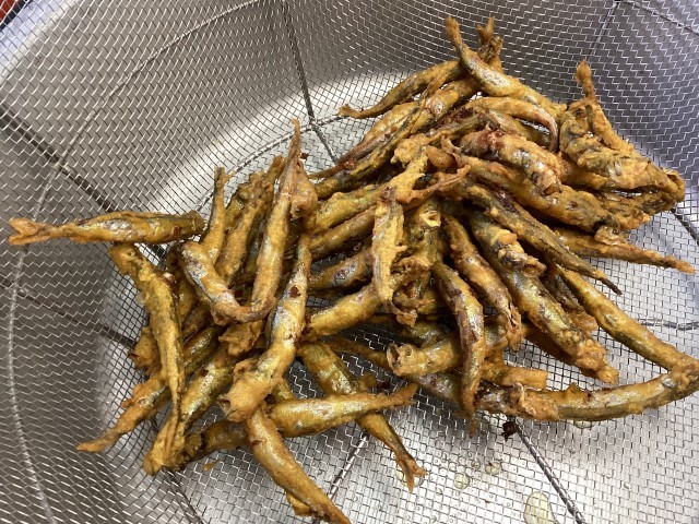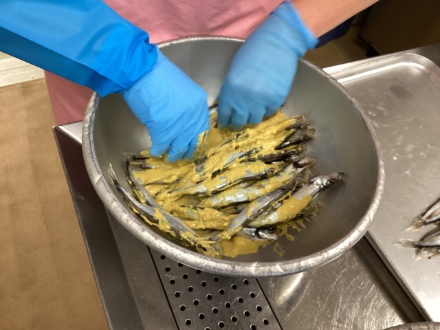 ※写真2枚目は、ししゃもにカレー粉を加えた衣をつけているところです。