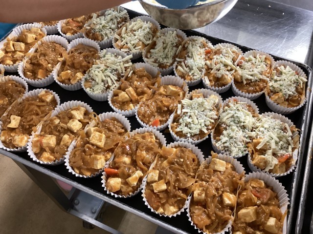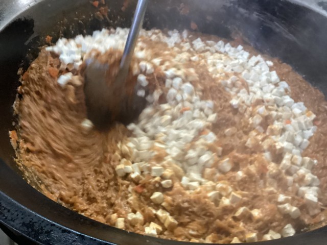玉ねぎなどの野菜を炒め、味付けし、ルーを入れたところに水気を切っておいた豆腐を加えます。