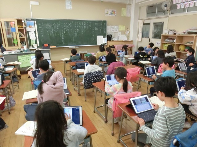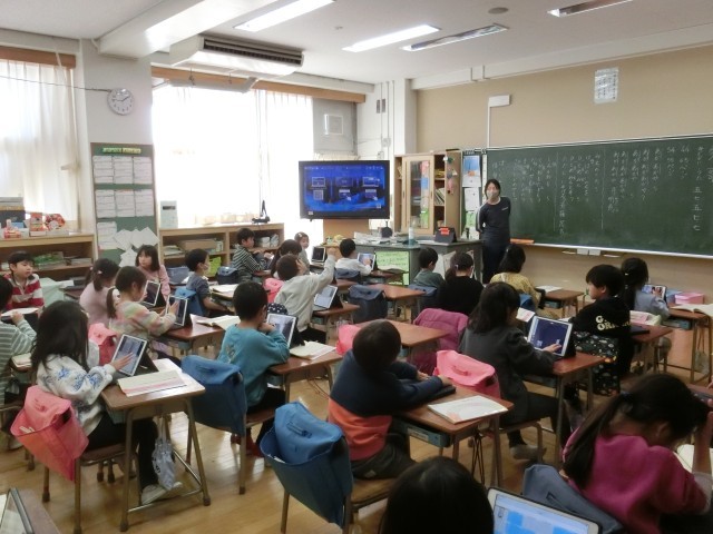 1年生は、教科「日本語」の学習をしていました。詩を読んで、自分の好きな所やいいなあと思う所を伝え合っていました。タブレットを使って自分の考えをまとめていましたが、タブレットの機能を上手に使って学習していました。