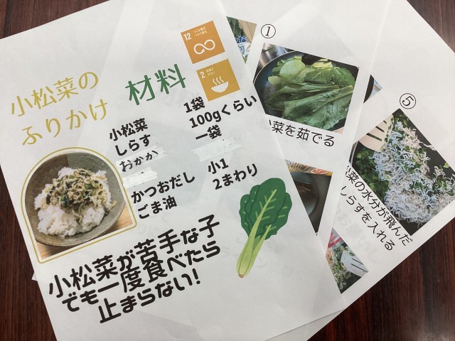 5年生が総合的な学習の時間の学習で、「残菜を減らす=野菜嫌いを克服して残さないメニュー」として、『小松菜のふりかけ』を提案してくれました。