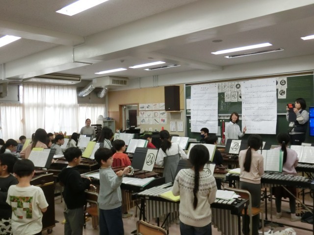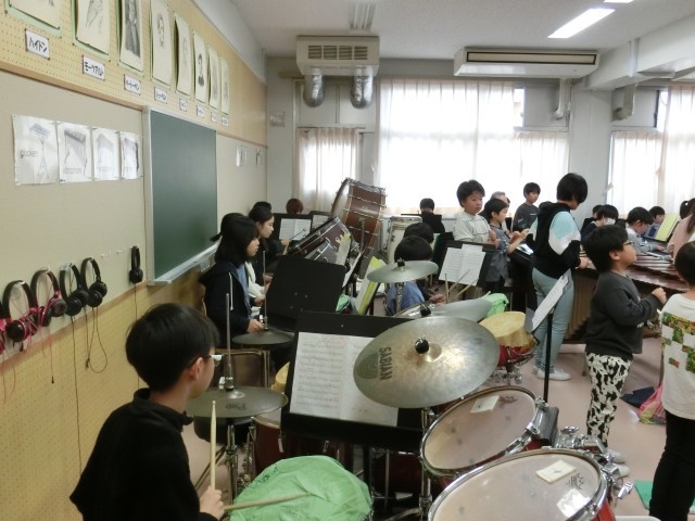 2年生と6年生の合同音楽の授業です。6年生の合奏に合わせて、2年生が「すず」でリズムを打ちます。迫力のあるかっこいい6年生の演奏に、2年生はノリノリでリズムを打っていました。6年生が2年生に優しくかかわる姿も、とっても素敵でした。