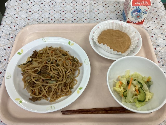 1年生から「今日の給食は?」と聞かれて「ソース焼きそばだよ。」と答えると歓声があがりました。