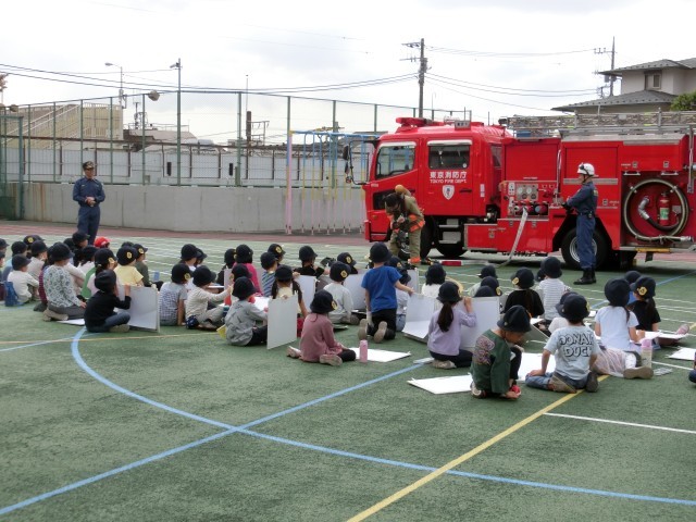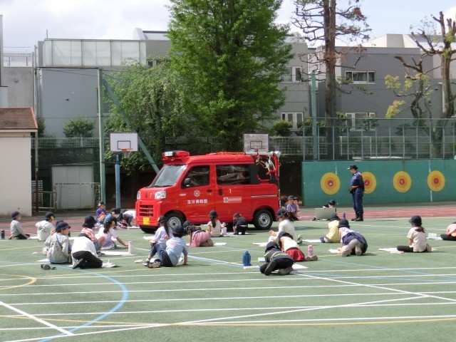 また、玉川消防署の消防士の方が、着替えの様子やはしごを設置する様子も見せてくださいました。いつも私たちの安全を守っていただいていることに感謝です。