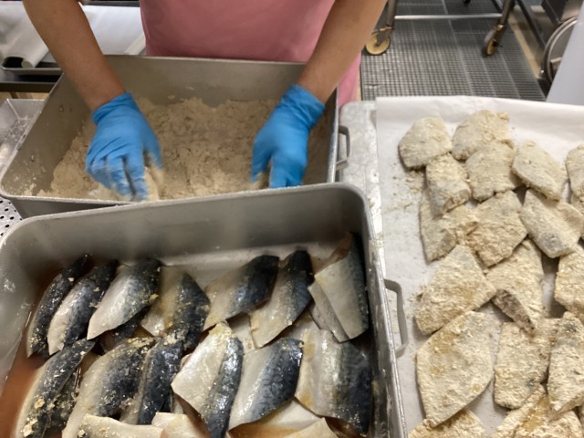 ※写真2枚目は、下味をつけた鯖に一つずつていねいに衣をつけているところです。