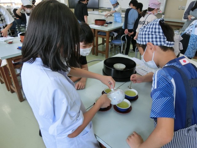 5年生が家庭科の実習でお茶をいれていました。グループの仲間と協力し、道具を丁寧に扱い、おいしいそうなお茶がはいりました。子どもたちは、自分たちでいれたお茶をじっくりと味わっていました。家庭でもおいしいお茶をいれて楽しめるといいですね!