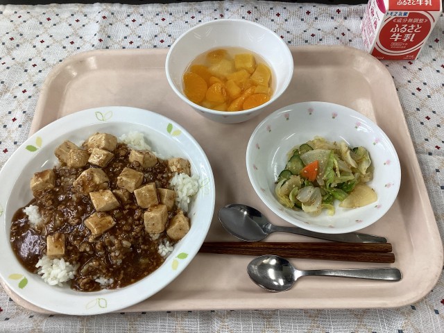 ひき肉とみじん切りにした野菜を豆板醤で炒め豆腐を入れて煮た料理です。