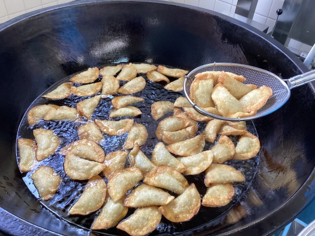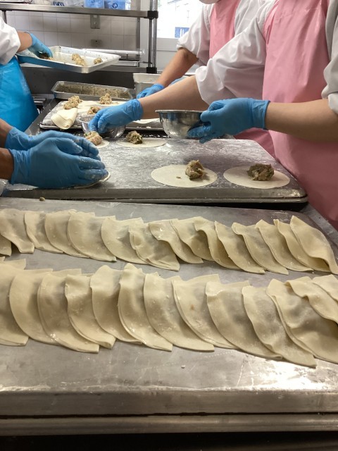 ※写真2枚目は、分業でぎょうざを包んでいるところです。