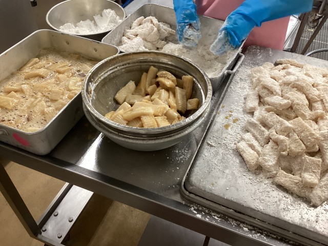※写真2枚目は、イカに下味をつけて粉をつけているところです。
