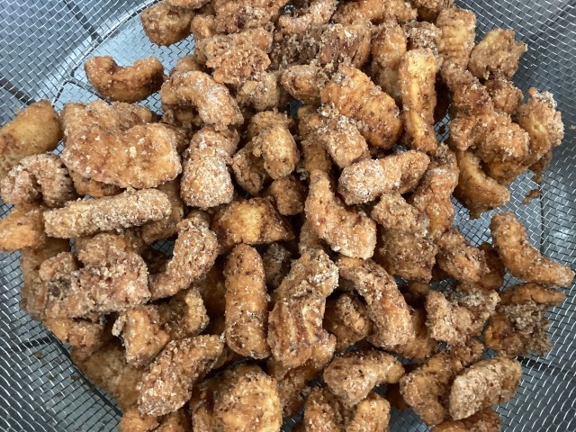 ※写真3枚目は、揚がったイカのかりんと揚げです。お菓子のかりんとうのように見えるでしょうか?