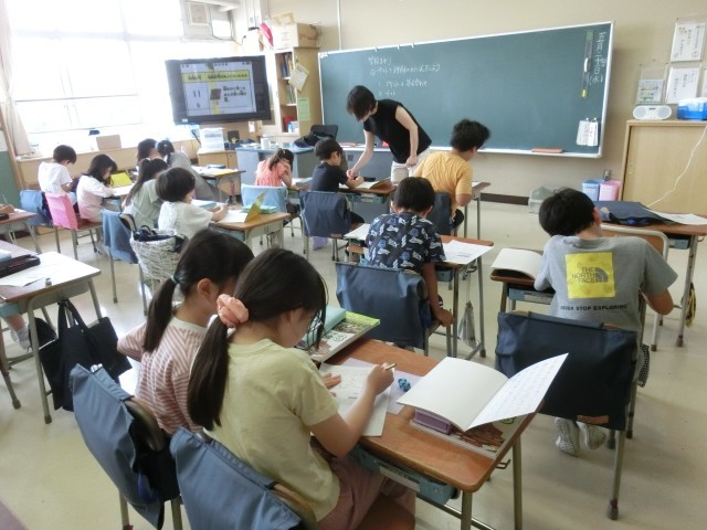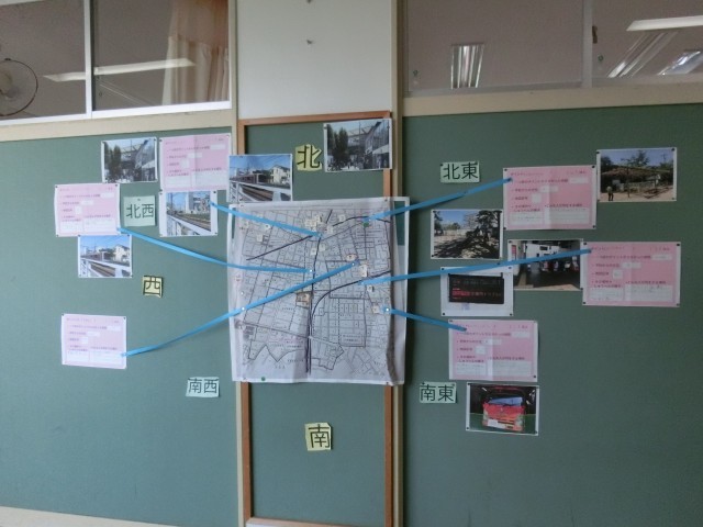 3年生の廊下掲示板には、社会科で町たんけんをしたまとめが掲示してあります。八幡小学校のまわりの町のようすが分かります。教室では、地図記号を勉強していました。