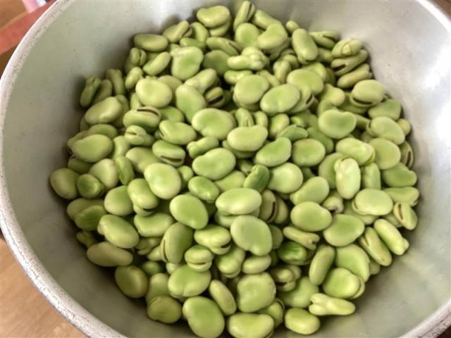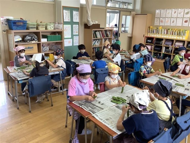 2年生が給食の食材、「そらまめ」のさやむきをしました。グリーンピースのさやむきに続いて、2度目の挑戦です。今回は、司書さんに「そらまめくんのベッド」の絵本を読み聞かせしてもらってから取り組みました。そらまめくんの気持ちになりながら、ふわふわベッドのさやにも親しみました。2年生がさやむきをしてくれたそらまめくんたちは、おいしい給食になりました。
