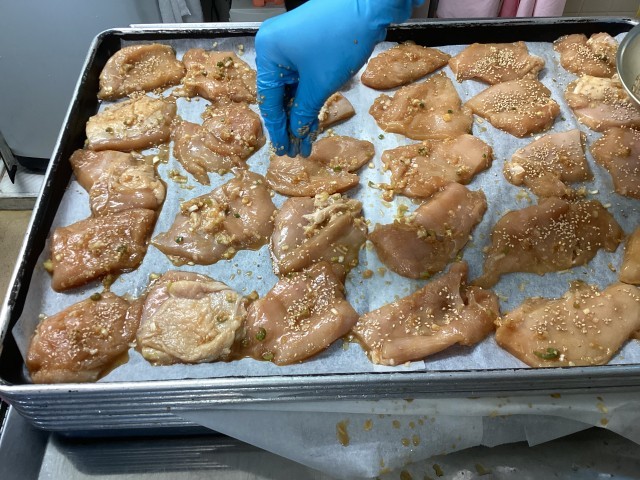 ※写真2枚目は、天板に鶏肉を並べて七味も一つ、ごまをふっているところです。