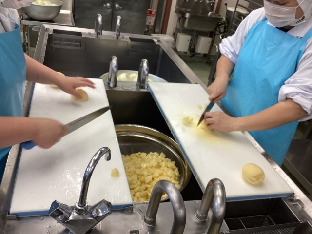 ※写真3枚目は、ジャーマンポテト用のじゃがいも35kを手切りしているところです。