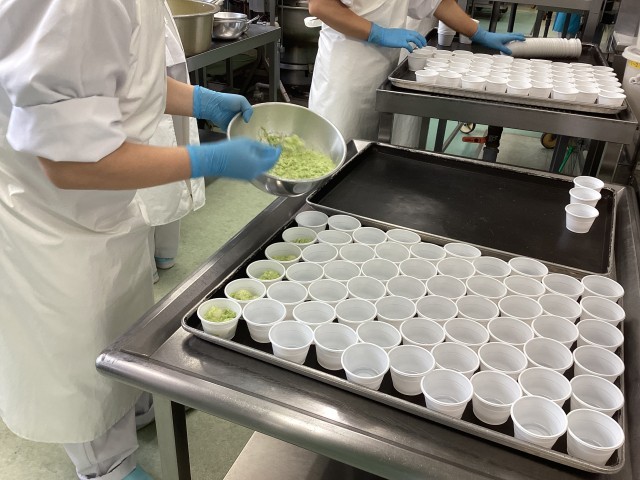 ※写真2枚目は、ずんだ団子を一人分ずつのカップに入れているところです。