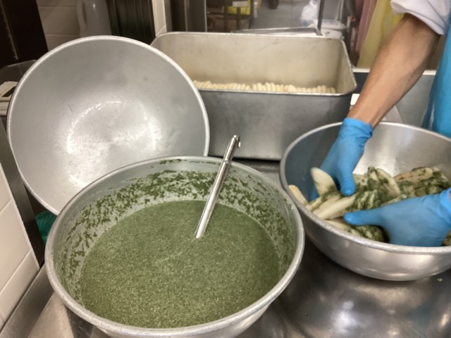 ※写真3枚目は、笹かまぼこに青のりが入った衣をつけているところです。